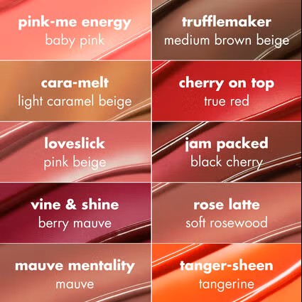 Pink-Me Energy - Ingredients: Bis-Behenyl/Isostearyl/Phytosteryl Dimer Dilinoleyl Dimer Dilinoleate, Diisostearyl Malate, Polyglyceryl-2 Triisostearate, Cetyl Ethylhexanoate, Synthetic Wax, Caprylic/Capric Triglyceride, Hydrogenated Styrene/Methylstyrene/Indene Copolymer, Ceresin, Fragrance (Parfum), Dimethicone, Mangifera Indica (Mango) Seed Butter, Microcrystalline Wax (Cera Microcristallina), Silica Dimethyl Silylate, Simmondsia Chinensis (Jojoba) Seed Oil, Squalane, Tocopheryl Acetate, Phenoxyethanol, Caprylyl Glycol, Pentaerythrityl Tetra-di-t-butyl Hydroxyhydrocinnamate, Persea Gratissima (Avocado) Oil, Prunus Armeniaca (Apricot) Kernel Oil, Punica Granatum Seed Oil, Benzaldehyde, Vanillin, Limonene, Pinene, Linalool May Contain: Titanium Dioxide (CI 77891), Yellow 5 Lake (CI 19140), Red 6 Lake (CI 15850), Red 7 (CI 15850) Cara-melt - Ingredients: Behenyl/Isostearyl/Phytosteryl Dimer Dilinoleyl Dimer Dilinoleate, Diisostearyl Malate, Polyglyceryl-2 Triisostearate, Cetyl Ethylhexanoate, Synthetic Wax, Caprylic/Capric Triglyceride, Hydrogenated Styrene/Methylstyrene/Indene Copolymer, Ceresin, Fragrance (Parfum), Dimethicone, Mangifera Indica (Mango) Seed Butter, Microcrystalline Wax (Cera Microcristallina), Silica Dimethyl Silylate, Simmondsia Chinensis (Jojoba) Seed Oil, Squalane, Tocopheryl Acetate, Phenoxyethanol, Caprylyl Glycol, Pentaerythrityl Tetra-di-t-butyl Hydroxyhydrocinnamate, Persea Gratissima (Avocado) Oil, Prunus Armeniaca (Apricot) Kernel Oil, Punica Granatum Seed Oil, Benzaldehyde, Vanillin, Limonene, Pinene, Linalool May Contain: Titanium Dioxide (CI 77891), Iron Oxides (CI 77492), Iron Oxides (CI 77491), Iron Oxides (CI 77499), Red 6 Lake (CI 15850) Loveslick - Ingredients: Bis-Behenyl/Isostearyl/Phytosteryl Dimer Dilinoleyl Dimer Dilinoleate, Diisostearyl Malate, Polyglyceryl-2 Triisostearate, Cetyl Ethylhexanoate, Synthetic Wax, Caprylic/Capric Triglyceride, Hydrogenated Styrene/Methylstyrene/Indene Copolymer, Ceresin, Fragrance (Parfum), Dimethicone, Mangifera Indica (Mango) Seed Butter, Microcrystalline Wax (Cera Microcristallina), Silica Dimethyl Silylate, Simmondsia Chinensis (Jojoba) Seed Oil, Squalane, Tocopheryl Acetate, Phenoxyethanol, Caprylyl Glycol, Pentaerythrityl Tetra-di-t-butyl Hydroxyhydrocinnamate, Persea Gratissima (Avocado) Oil, Prunus Armeniaca (Apricot) Kernel Oil, Punica Granatum Seed Oil, Benzaldehyde, Vanillin, Limonene, Pinene, Linalool May Contain:Titanium Dioxide (CI 77891), Red 7 (CI 15850), Iron Oxides (CI 77492), Iron Oxides (CI 77491), Red 6 Lake (CI 15850), Iron Oxides (CI 77499) Rose Latte - Ingredients: Bis-Behenyl/Isostearyl/Phytosteryl Dimer Dilinoleyl Dimer Dilinoleate, Diisostearyl Malate, Polyglyceryl-2 Triisostearate, Cetyl Ethylhexanoate, Synthetic Wax, Caprylic/Capric Triglyceride, Hydrogenated Styrene/Methylstyrene/Indene Copolymer, Ceresin, Fragrance (Parfum), Dimethicone, Mangifera Indica (Mango) Seed Butter, Microcrystalline Wax (Cera Microcristallina), Silica Dimethyl Silylate, Simmondsia Chinensis (Jojoba) Seed Oil, Squalane, Tocopheryl Acetate, Phenoxyethanol, Caprylyl Glycol, Pentaerythrityl Tetra-di-t-butyl Hydroxyhydrocinnamate, Persea Gratissima (Avocado) Oil, Prunus Armeniaca (Apricot) Kernel Oil, Punica Granatum Seed Oil, Benzaldehyde, Vanillin, Limonene, Pinene, Linalool May Contain: Titanium Dioxide (CI 77891), Iron Oxides (CI 77491), Iron Oxides (CI 77492), Red 7 Lake (CI 15850), Iron Oxides (CI 77499) Mauve Mentality - Ingredients: Bis-Behenyl/Isostearyl/Phytosteryl Dimer Dilinoleyl Dimer Dilinoleate, Diisostearyl Malate, Polyglyceryl-2 Triisostearate, Cetyl Ethylhexanoate, Synthetic Wax, Caprylic/Capric Triglyceride, Hydrogenated Styrene/Methylstyrene/Indene Copolymer, Ceresin, Fragrance (Parfum), Dimethicone, Mangifera Indica (Mango) Seed Butter, Microcrystalline Wax (Cera Microcristallina), Silica Dimethyl Silylate, Simmondsia Chinensis (Jojoba) Seed Oil, Squalane, Tocopheryl Acetate, Phenoxyethanol, Caprylyl Glycol, Pentaerythrityl Tetra-di-t-butyl Hydroxyhydrocinnamate, Persea Gratissima (Avocado) Oil, Prunus Armeniaca (Apricot) Kernel Oil, Punica Granatum Seed Oil, Benzaldehyde, Vanillin, Limonene, Pinene, Linalool May Contain:Titanium Dioxide (CI 77891), Iron Oxides (CI 77492), Iron Oxides (CI 77491), Red 7 Lake (CI 15850), Iron Oxides (CI 77499), Blue 1 Lake (CI 42090) Trufflemaker - Ingredients: Bis-Behenyl/Isostearyl/Phytosteryl Dimer Dilinoleyl Dimer Dilinoleate, Diisostearyl Malate, Polyglyceryl-2 Triisostearate, Cetyl Ethylhexanoate, Synthetic Wax, Caprylic/Capric Triglyceride, Hydrogenated Styrene/Methylstyrene/Indene Copolymer, Ceresin, Fragrance (Parfum), Dimethicone, Mangifera Indica (Mango) Seed Butter, Microcrystalline Wax (Cera Microcristallina), Silica Dimethyl Silylate, Simmondsia Chinensis (Jojoba) Seed Oil, Squalane, Tocopheryl Acetate, Phenoxyethanol, Caprylyl Glycol, Pentaerythrityl Tetra-di-t-butyl Hydroxyhydrocinnamate, Persea Gratissima (Avocado) Oil, Prunus Armeniaca (Apricot) Kernel Oil, Punica Granatum Seed Oil, Benzaldehyde, Vanillin, Limonene, Pinene, Linalool May Contain: Iron Oxides (CI 77491), Iron Oxides (CI 77499), Iron Oxides (CI 77492), Titanium Dioxide (CI 77891), Red 7 Lake (CI 15850) Cherry On Top - Ingredients: Bis-Behenyl/Isostearyl/Phytosteryl Dimer Dilinoleyl Dimer Dilinoleate, Diisostearyl Malate, Polyglyceryl-2 Triisostearate, Cetyl Ethylhexanoate, Synthetic Wax, Caprylic/Capric Triglyceride, Hydrogenated Styrene/Methylstyrene/Indene Copolymer, Ceresin, Fragrance (Parfum), Dimethicone, Mangifera Indica (Mango) Seed Butter, Microcrystalline Wax (Cera Microcristallina), Silica Dimethyl Silylate, Simmondsia Chinensis (Jojoba) Seed Oil, Squalane, Tocopheryl Acetate, Phenoxyethanol, Synthetic Fluorphlogopite, Caprylyl Glycol, Mica, Pentaerythrityl Tetra-di-t-butyl Hydroxyhydrocinnamate, Calcium Aluminum Borosilicate, Tin Oxide, Persea Gratissima (Avocado) Oil, Prunus Armeniaca (Apricot) Kernel Oil, Punica Granatum Seed Oil, Benzaldehyde, Vanillin, Limonene, Pin